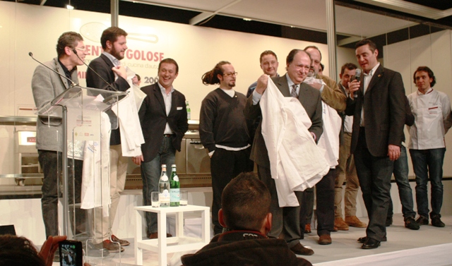 Grande festa a Identità Golose per i nuovi 6 JRE. Era anche il momento del passaggio ufficiale della Presidenza da Marco Bistarelli a Emanuele Scarello, ed anche il momento nel quale i giovani chef hanno voluto ringraziare la critica gastronomica. Assente (per neve, ma poi è arrivato) Fausto Arrighi della Michelin, sul palco sono saliti Enzo Vizzari dell’ Espresso, Marco Bolasco del Gambero Rosso, Luigi Cremona del Touring Club