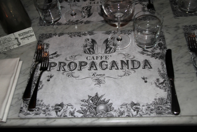 Spopola questo nuovo Caffè Propaganda di Roma vicino al Colosseo, c’è sempre un capannello di gente in attesa nonostante non manchino le alternative nel vicinato (a meno di cento metri il Maud, il Crab, il WineConcept). L’ambientazione e l’ arredo sono di classe, la comunicazione è stata studiata, il menù ispira fiducia anche perchè è firmato da un bravo e noto professionista: Arcangelo Dandini.