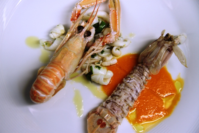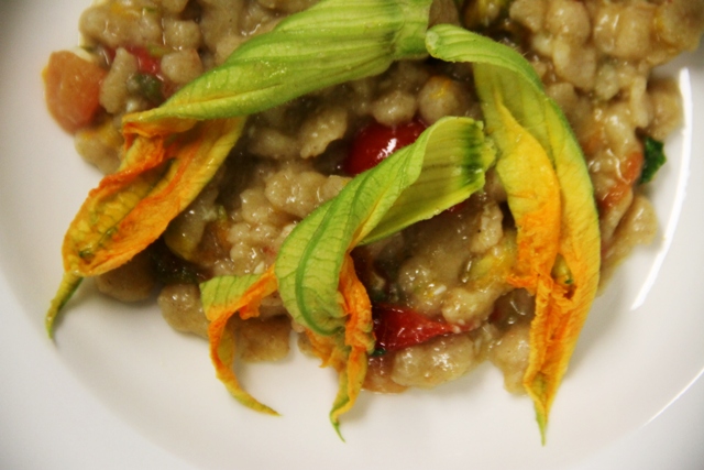 granetti di farro con scampetti e fiori di zucca