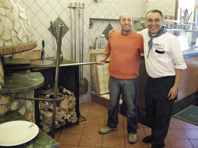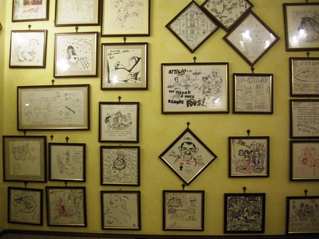 Ecco alla parete l’ antico menù con i prezzi in vecchie lire! Siamo vicini al folkloristico mercato di Pignsecca a pochi metri da piazza Carità , quindi in zona comoda e centralissima.  Le pareti testimoniano con mille disegni e ricordi la bravura ma anche la simpatia dei titolari, come il nipote del fondatore, anche lui Attilio. Bravo e infaticabile, scherza qui sotto con Enzo Coccia, fors eil più famoso e bravo piazzaiolo napoletanoò
