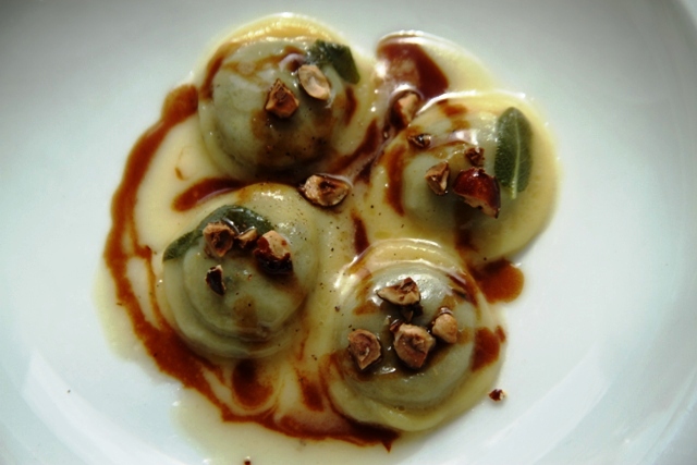 Ravioli di patate con interiora sugo di piccione e nocciole caramellate