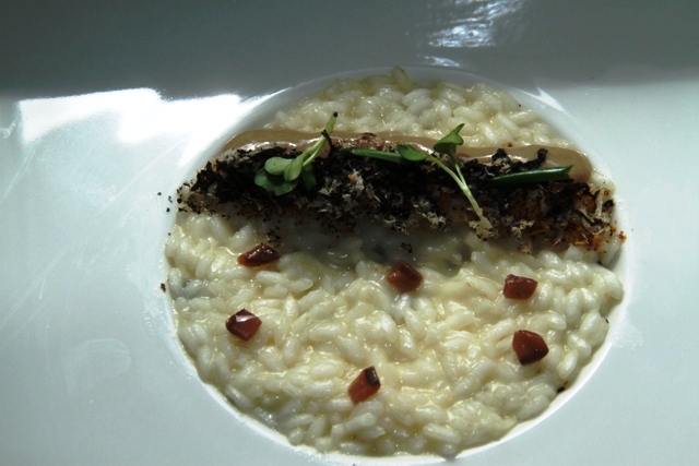 Risotto alici del cantabrico , nocciole tostate , tartufo nero e bagna cauda