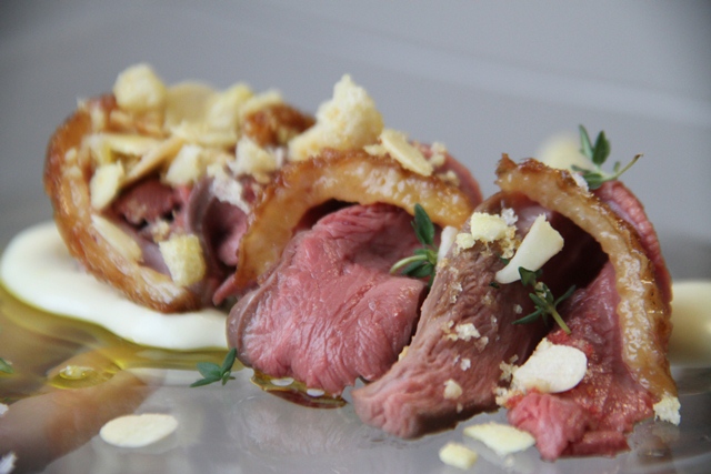 Petto d’oca laccato, zucchero di canna, crema di menconico croccante di mandorla e erbe limoncina