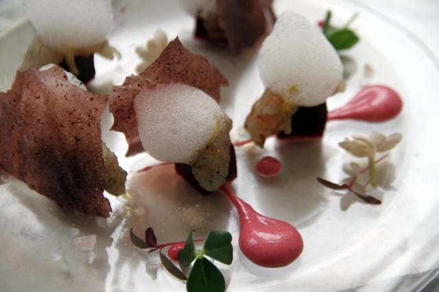 Gamberi di fiume marinati al Pinot Nero (metodo classico) dell’Oltrepò Pavese e la sua schiuma, maionese, barbabietola, riso Venere croccante, germogli e fiori
