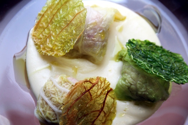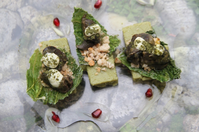 Cremoso di verza ed il suo croccante, lumache, burro ed erbe fini, terra di pane ai cereali, crema di aglio dolce e melograno fresco