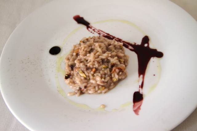 Risotto con fichi bianchi del cilento pistacchi provola riduzione di aglianico e melassa di fichi