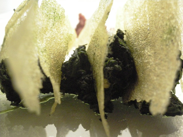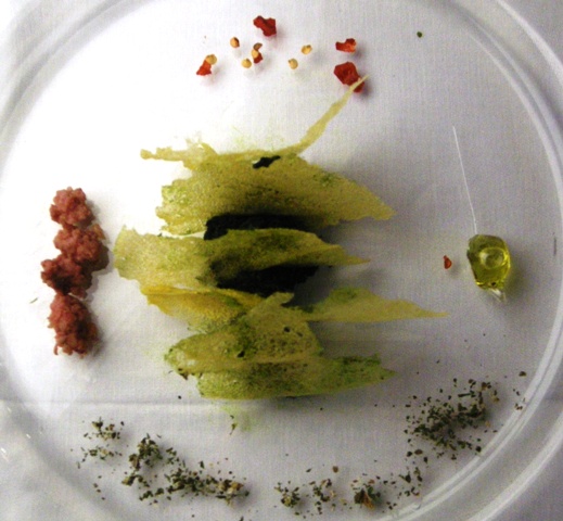 Da una ricetta tradizionale, cicoria e polenta, ecco Marco Bottega regalarci una bella ricetta innovativa, dove la cicoria viene a lungo ripassata per concentrarne il sapore, la polenta stesa in sfoglie sottilissime (fin troppo sottili) e l’ aglio olio e peperoncino del condimento racchiusi in una bolla di zucchero vetrificato. http://www.agriturismoaminta.it/Â a Genazzano.