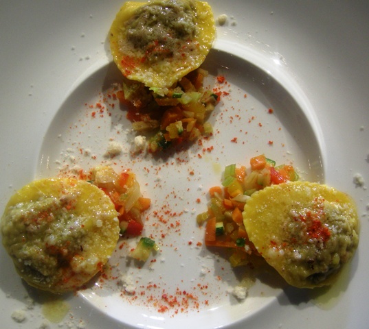 ravioli ripieni di “picula ad caval” e peperoni con polvere di peperoni e nocciole